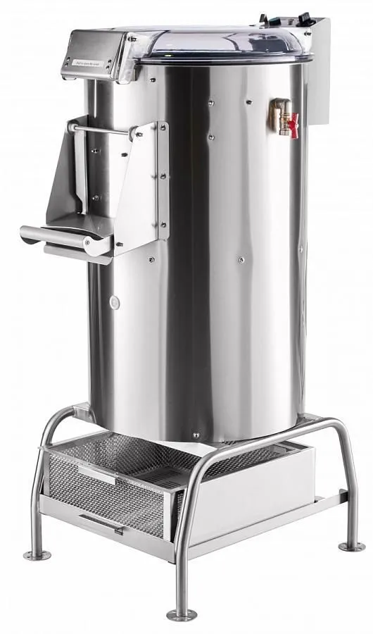 Преимущественные особенности модели: абразивная поверхность диска и камеры с правильной формой зерна — производительность выше в 5 раз, ресурс в 2 раза; трамплины на диске и стенках камеры позволяют выполнять качественную очистку любых корнеплодов; установлен разбрызгиватель для более качественной очистки и мытья корнеплодов; таймер с установкой от 1 до 5 минут; включение посредством поворота таймера; выгрузка очищенных корнеплодов под воздействием центробежной силы; на дне поддона сливное отверстие; влагозащита — класс IP 23. Рабочие параметры: вместимость бункера — 27кг; в час очищает до 500кг корнеплодов; время одного цикла обработки — 2 минуты.