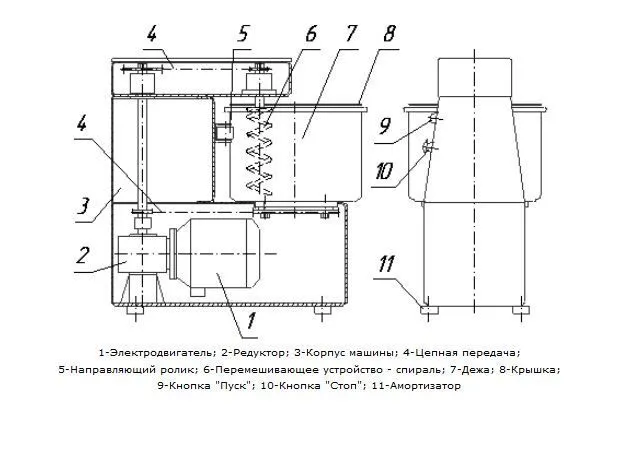 • Электропривод машины вращает дежу, наполненную смесью для приготовления теста. Одновременно с вращением дежи вращается спираль, которая перемешивает тесто. Совместным вращением дежи вокруг своей оси и спирали внутри дежи