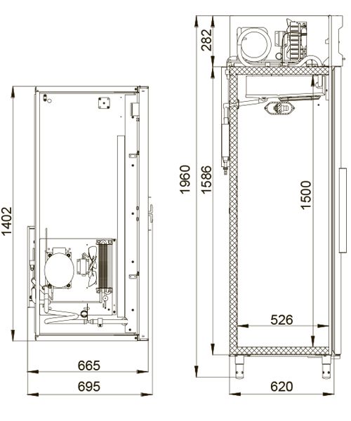 Вместительный двухдверный холодильный шкаф объемом 1000 л, благодаря компактным размерам, легко пройдет в стандартный дверной проем. Электронный блок управления имеет настройки, позволяющие устанавливать нужную температуру в диапазоне от +1 до +15°С. Микропереключатель отключает вращение вентилятора воздухоохладителя и включает внутреннюю подсветку.