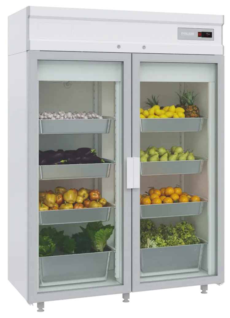 Шкаф увеличенной вместимости с распашными дверьми в алюминиевых рамах с легко заменяемыми стеклопакетами, съемным уплотнителем с магнитной вставкой, механизмом самозакрывания. Полки гастронормированы GN 2/1.