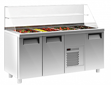 Стол для салатов Сarboma T70 M2sal-1-G 0430 (SL 2GNG) предназначен для обработки ингредиентов для приготовления салатов, охлаждения и кратковременного хранения скоропортящихся продуктов и напитков на предприятиях общественного питания и торговли. Модель оснащена 4 полками и регулируемыми ножками высотой от 90 до 110 мм. Цельнозаливной корпус выполнен из нержавеющей стали с теплоизоляцией из пенополиуретана, дверцы - из стекла.