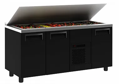 Холодильный стол Carboma T70 M3sal-1-G 9006 (SL 3GNG) предназначен для обработки ингредиентов для приготовления салатов, охлаждения и кратковременного хранения скоропортящихся продуктов и напитков на предприятиях общественного питания и торговли. Модель оснащена дверью с доводчиком и регулируемыми по высоте ножками высотой от 90 до 110 мм. Цельнозаливной корпус выполнен из оцинкованной стали толщиной 50 мм, столешница - из нержавеющей стали, дверцы - из стекла.