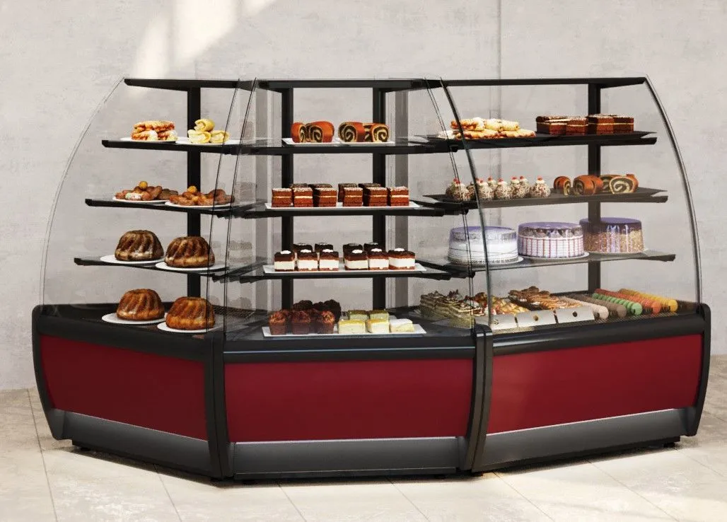 Витрина идеальна для стильной демонстрации выпечки, тортов, пироженых, пиццы. Панорамное сферическое стекло и стеклянные полки с подсветкой представляют товар с наилучшей стороны.