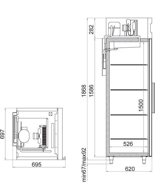 Температурный диапазон до -18°С обеспечивается динамической системой охлаждения. В сочетании с верхним расположением агрегата это обеспечивает равномерное распределение холодного воздуха по всему объёму камеры. Экологически безопасный хладагент R404a легко заправлять при помощи клапана Шредера. Оттайка производится в автоматическом режиме, при помощи ТЭНа. Предусмотрена система испарения конденсата. Также установлены ПЭНы обогрева дверного проёма, трубки слива конденсата и компенсационного клапана. Это значительно облегчает обслуживание устройства Polair.