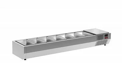 Оборудование может быть установлено на борта специальных столов для приготовления пиццы, а так же может использоваться, как самостоятельное изделие, и снабжено регулируемыми ножками-опорами. По конструктивному исполнению витрина холодильная состоит из теплоизолированного корпуса со встроенным холодильным модулем. Крышка над холодильным агрегатом выполнена в виде горизонтальной площадки и выполняет роль столешницы для сопутствующих и вспомогательных предметов. Испаритель расположен внутри ванны для гастроёмкостей. В ванне имеется отверстие для слива конденсата, который попадает в специальную ёмкость с выпаривателем в машинном отделении.