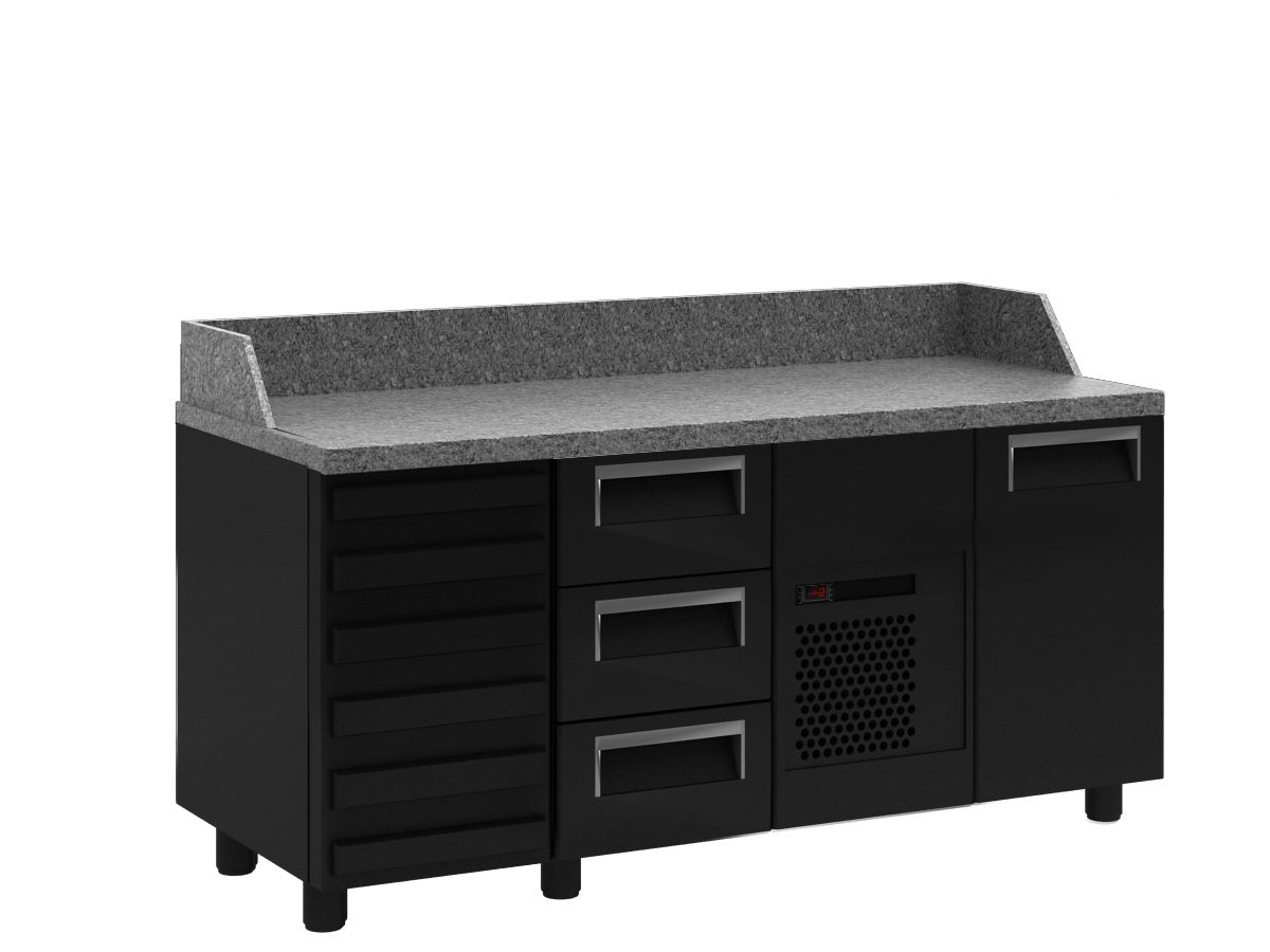 Серия столов PIZZA глубиной 700мм с боковым расположением агрегата. Столешница с бортом с трех сторон (высота борта 140 мм) из натурального или искусственного камня. На борта можно поставить настольные витрины линейки А30 и А40. Стойки под хранение коржей.