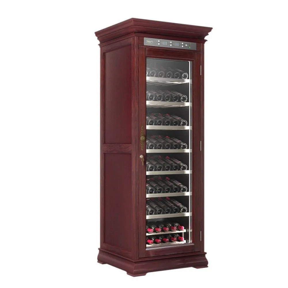 Классический винный шкаф C108-WM1 (Classic) является стильным дополнением к вашему дому и прекрасным помощником в вопросе хранения вина. Объем данного шкафа составляет 300 литров, а это означает, что вы с легкостью можете разместить внутри него до 108 бутылок вина типа Бордо объемом по 0, 75 литра. Данная модель является отдельностоящей, а это означает что у вас появится не просто многофункциональный помощник, но также и стильное дополнение к вашему интерьеру. Данный винный шкаф не подразумевает разделения на зоны, соответственно, вы можете разместить в нем вина только одного типа. Температурный режим может быть выставлен любой в диапазоне от +5 до +22 ˚С. Уникальная опция линейки данных шкафов - наличие цифрового контроля влажности. Тип охлаждения - компрессорный. Корпус данного винного шкафа классический из дерева цвета махагон (американский дуб). В базовой комплектации имеются деревянные выкатные полки в количестве 8 штук.