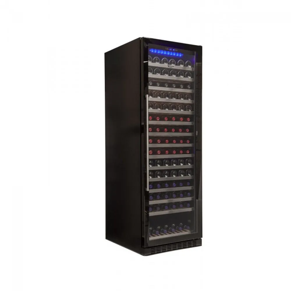 Шкаф оснащен электронной панелью управления, с помощью которой пользователь выбирает необходимый температурный режим работы аппарата. На ней расположены кнопки для регулировки температуры и включения освещения. Обратите внимание, что на панели управления есть два дисплея: на левом отображается заданная пользователем температура, на правом дисплее отображается текущая температура внутри винного шкафа. В винном холодильнике Cold Vine C165-KBT1 предусмотрена возможность перевешивания двери на другую сторону, что дает дополнительное удобство при установке холодильника в подходящее по габаритам место.