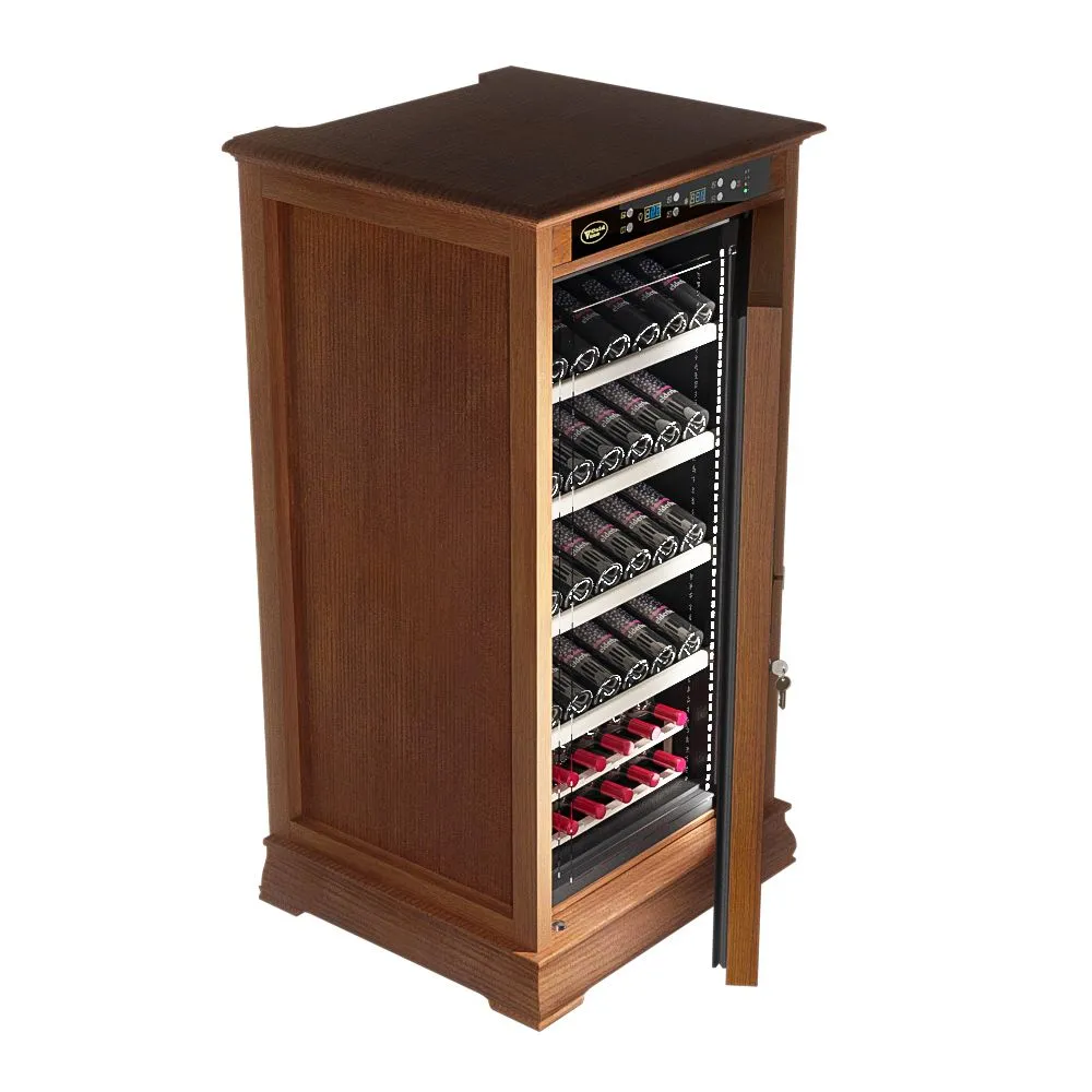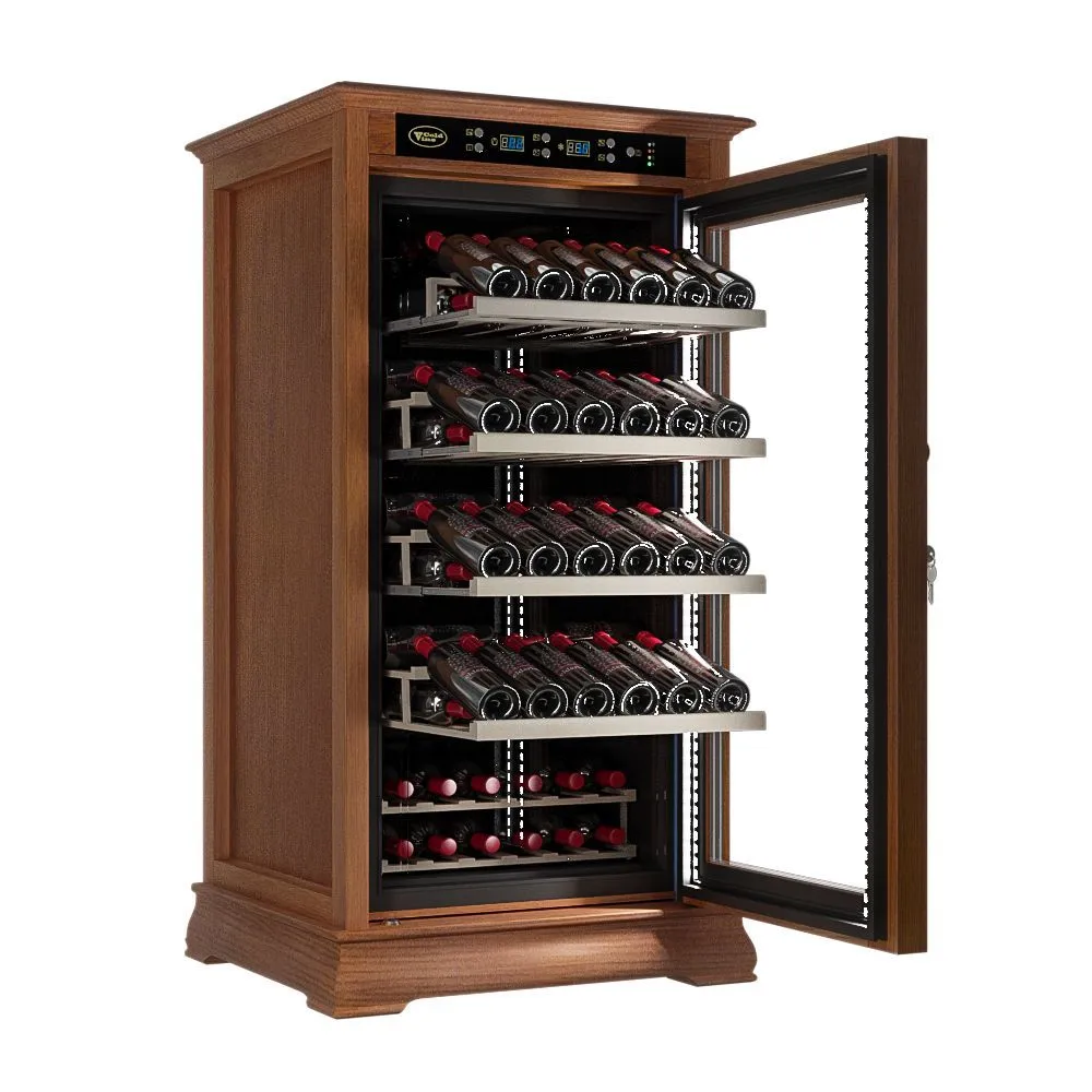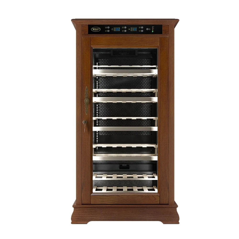 Классический винный шкаф Cold Vine C66-WM1 (Classic) является стильным дополнением к вашему дому и прекрасным помощником в вопросе хранения вина. Объем данного шкафа составляет 200 литров, а это означает, что вы с легкостью можете разместить внутри него до 66 бутылок вина типа Бордо объемом по 0, 75 литра. Данная модель является отдельностоящей, а это означает что у вас появится не просто многофункциональный помощник, но также и стильное дополнение к вашему интерьеру. Данный винный шкаф не подразумевает разделения на зоны, соответственно, вы можете разместить в нем вина только одного типа. Температурный режим может быть выставлен любой в диапазоне от +5 до +22 ˚С. Уникальная опция линейки данных шкафов - наличие цифрового контроля влажности. Тип охлаждения - компрессорный. Корпус данного винного шкафа выполнен из натурального дерева цвета орех (американский дуб). В базовой комплектации имеются деревянные выкатные полки в количестве 5 штук.