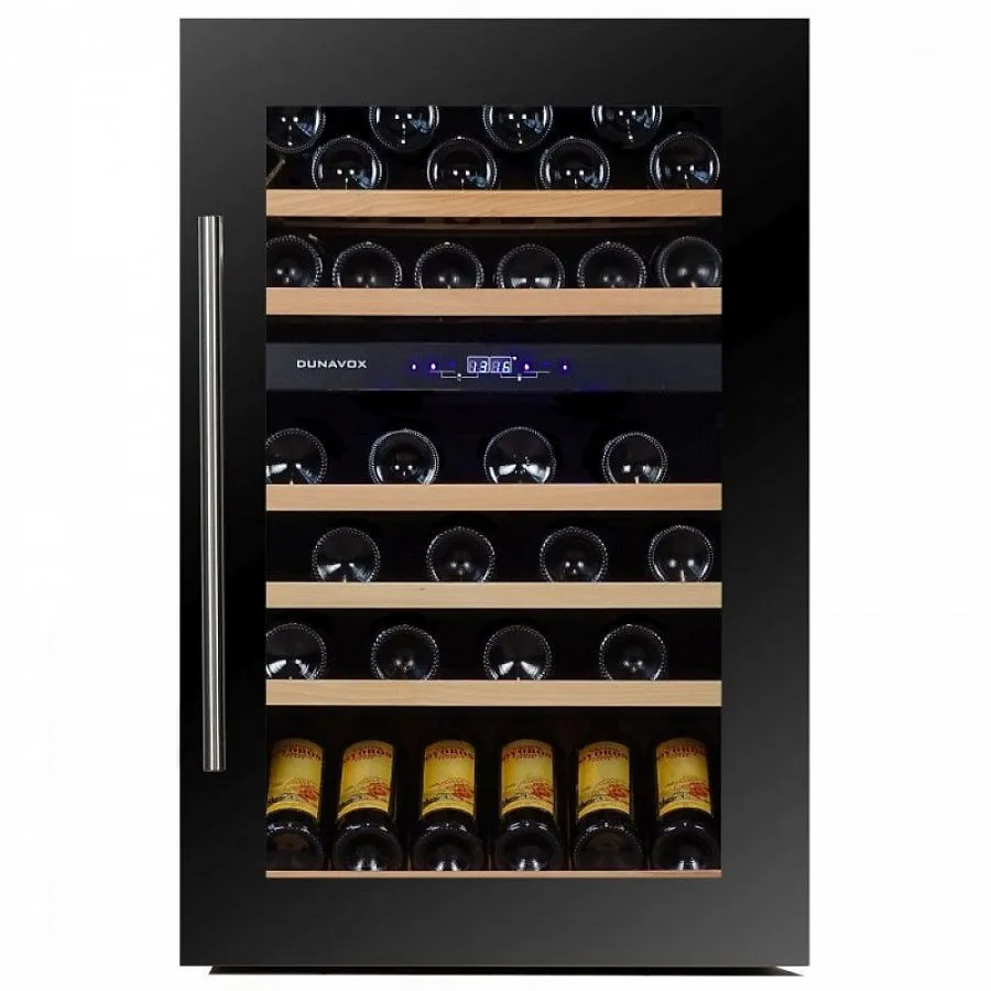 Корпус модели DX-57.146DBK металлический с покрытием черного цвета, дверца выполнена из прозрачного двойного стеклопакета, защищенного от воздействия ультрафиолетовых лучей. Ручка двери удобная, накладная, выполнена из нержавеющей стали. Цифровой индикатор температуры и внутреннее освещение на светодиодах синего цвета.