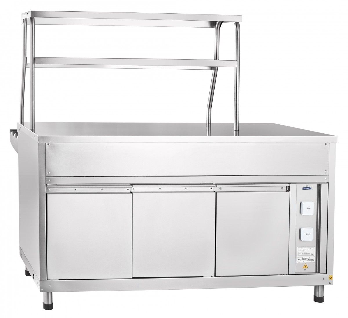 Прилавок для горячих напитков Abat ПГН-70КМ-01 используется для кратковременного хранения и раздачи потребителю хлебобулочных и кондитерских изделий, а также для установки на его столе термостата с напитками. Двухуровневая полка над прилавком, длинной 752 мм., оборудованная подсеткой служит для выкладки порционных блюд или напитков. На прилавке установлена розетка 220 В для подключения термостата или кипятильника. Внизу нейтральный шкаф для хранения кухонного инвентаря. Направляющие для подносов и полки входят в комплект поставки. Прилавок имеет регулируемые ножки.