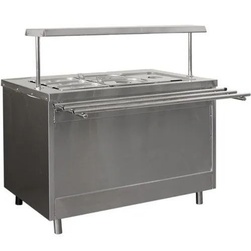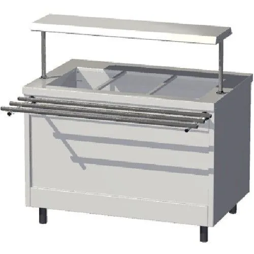 Сверху, на мармит, установлена ванна с 3-мя гнёздами для установки гастрономических ёмкостей, обрамлённая столешницей. Внизу ванны расположен желоб, дно которого имеет уклон в сторону отверстия для слива воды. В желобе установлен ТЭН. Наполнение желоба водой – вручную.