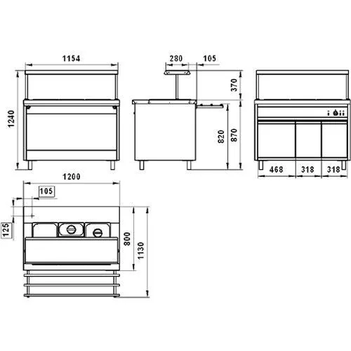 На мармит так же устанавливаются полка, с расположенным под ней светильником освещения рабочей зоны и направляющие для установки подносов со стороны потребителя.