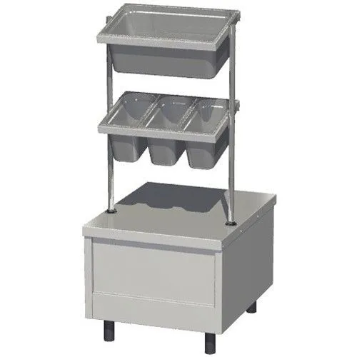 Сверху прилавок накрыт столешницей. На прилавке установлены стойки. К стойкам крепятся гнёзда для установки гастрономических ёмкостей, предназначенных для хранения столовых приборов и хлеба.