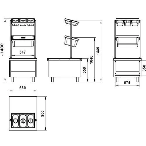 Под столешницей расположен технологический отсек (площадь пола – 0,4 м2, объём – 0,15 м3) для хранения запаса подносов и столовых приборов