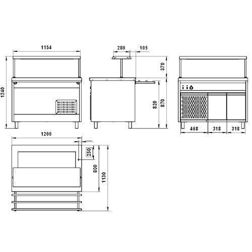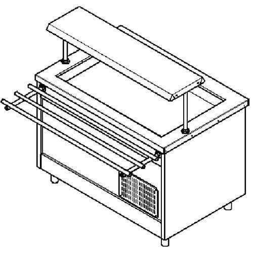 Сверху, на прилавок, установлена охлаждаемая ванна, обрамлённая столешницей. На прилавок устанавливаются полка, с расположенным под ней, светильником освещения охлаждаемой ванны и направляющие для установки подносов со стороны потребителя.
