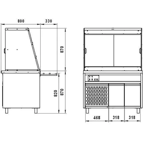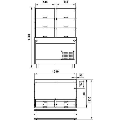 В охлаждаемом объёме витрины установлены две полки. Каждая полка и столешница витрины освещаются индивидуальными светильниками. Со стороны потребителя установлены направляющие для подносов.