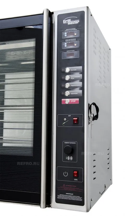 Описание Конвекционный гриль для кур Гриль мастер Ф3кэл/1 с электронной панелью 1 уровня — это современное и удобное тепловое оборудование от отечественного производителя. Данная модель способна всего за 55 минут приготовить до 40 тушек кур. Аппарат имеет 4 режима работы гриля: готовка, подрумянивание, удержание и разогрев. Температура приготовления регулируется в диапазоне от +50 до +250 ° С.