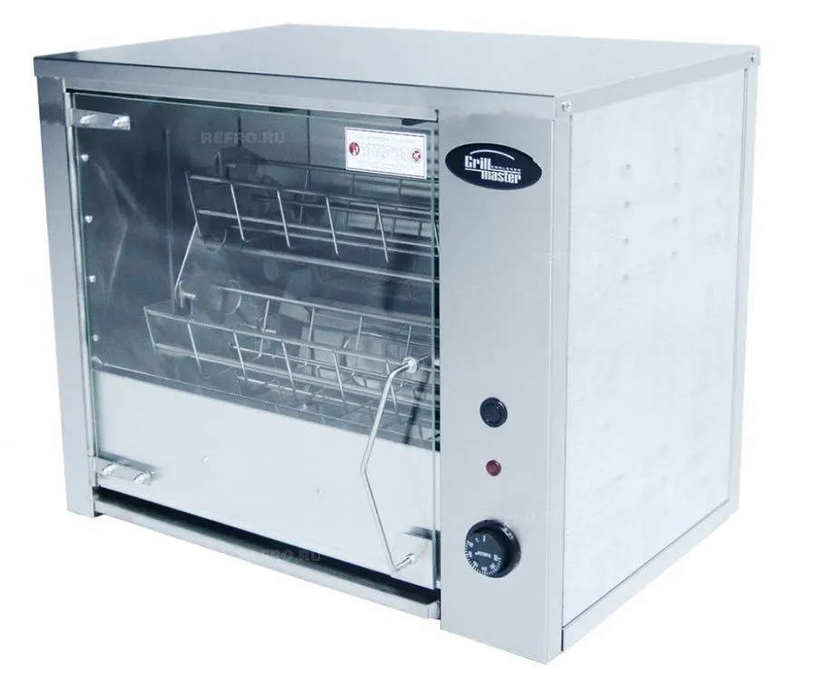 Гриль для кур Гриль мастер Ф3кмэ(э) - настольная модель карусельного типа, выполненная в нержавеющем корпусе, дверцы из термостойкого закаленного стекла. Аппарат оснащен бесшумным итальянским мотором. Позволяет качественное приготовление одновременно 8 тушек кур, окорочков, грудок. Отличный выбор для заведений фаст-фуда. Электрический гриль подключается к сети 220В.