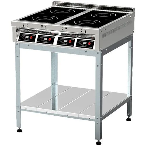Индукционные конфорки установлены на жёсткий каркас и обрамлены столешницей из нержавеющей стали. Стеклокерамические рабочие поверхности индукционных конфорок расположены в одной плоскости со столешницей.