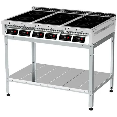 Индукционные конфорки установлены на жёсткий каркас и обрамлены столешницей из нержавеющей стали. Стеклокерамические рабочие поверхности индукционных конфорок расположены в одной плоскости со столешницей.