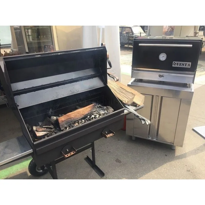 Уголь или дрова укладываются в отдельный ящик (камеру). Над ним можно готовить шашлык, жарить стейки как в обычном мангале. Там же можно установить подставку для казана и приготовить ароматный плов. Вторая камера предназначена для косвенного нагрева. В ней готовится барбекю, можно коптить любые продукты.