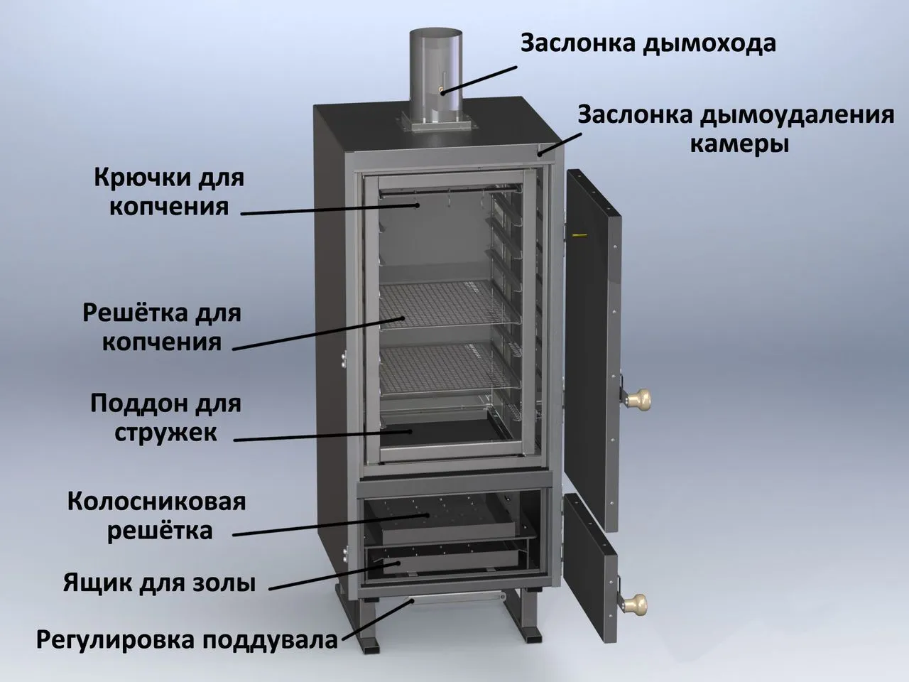 - Конструкция коптильни выполнена по схеме "камера в камере", которая обеспечивает разделение рабочего объема и топки