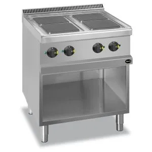 Плита 4 конфорочн.700 СЕР. Apach APRE-77P предназначена для приготовления различных блюд из мяса, птицы, рыбы и овощей в наплитной посуде на предприятиях общественного питания и торговли. Модель оснащена электромеханической панелью управления, быстро нагревающимися конфорками, гидроизолированной прессованной поверхностью и открытой подставкой с регулируемыми по высоте ножками. Корпус, рабочая поверхность, панель управления и вытяжная решетка выполнены из нержавеющей стали AISI 304, боковые и задняя панели - из нержавеющей стали AISI 430.