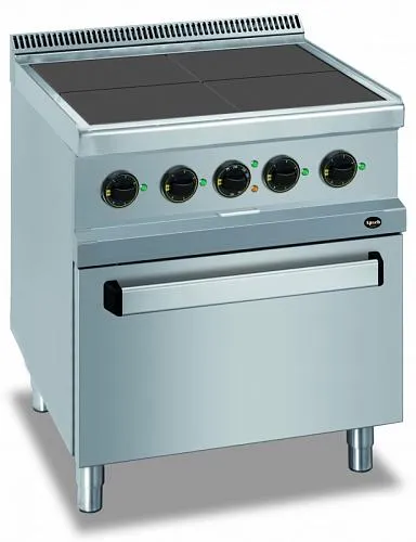 Плита 4 конфорочн. 700 СЕР. Apach APRE-77QFE предназначена для приготовления различных блюд из мяса, птицы, рыбы и овощей в наплитной посуде на предприятиях общественного питания и торговли. Модель оснащена электромеханической панелью управления, быстро нагревающимися конфорками, гидроизолированной прессованной поверхностью и регулируемыми по высоте ножками. Корпус, рабочая поверхность, панель управления и вытяжная решетка выполнены из нержавеющей стали AISI 304, боковые и задняя панели - из нержавеющей стали AISI 430.