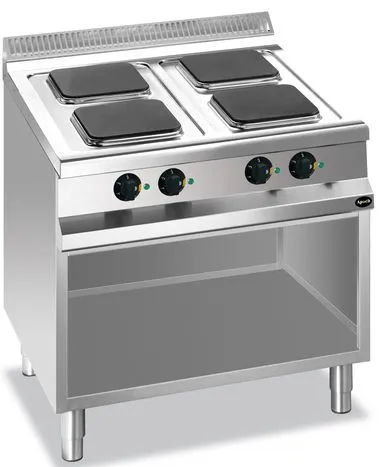 Плита электрическая Apach APRE-89P предназначена для приготовления различных блюд из мяса, птицы, рыбы и овощей в наплитной посуде на предприятиях общественного питания и торговли. Модель оснащена электромеханической панелью управления, быстро нагревающимися конфорками, гидроизолированной прессованной поверхностью и открытой подставкой с регулируемыми по высоте ножками. Корпус, рабочая поверхность, панель управления и вытяжная решетка выполнены из нержавеющей стали AISI 304, боковые и задняя панели - из нержавеющей стали AISI 430.