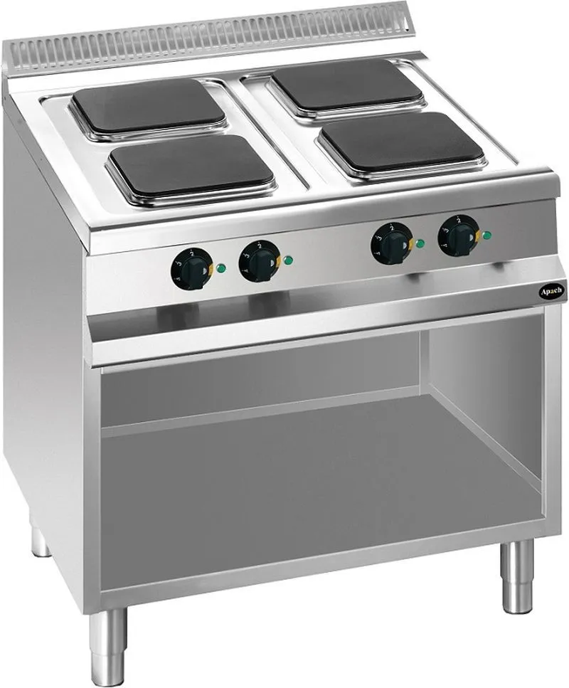 Плита электрическая Apach APRGS-89P 900-й серии предназначена для приготовления различных блюд из мяса, птицы, рыбы и овощей в наплитной посуде на предприятиях общественного питания и торговли. Модель оснащена электромеханической панелью управления, быстро нагревающимися конфорками, гидроизолированной прессованной поверхностью и открытой подставкой с регулируемыми по высоте ножками. Корпус, рабочая поверхность, панель управления и вытяжная решетка выполнены из нержавеющей стали AISI 304, боковые и задняя панели - из нержавеющей стали AISI 430.