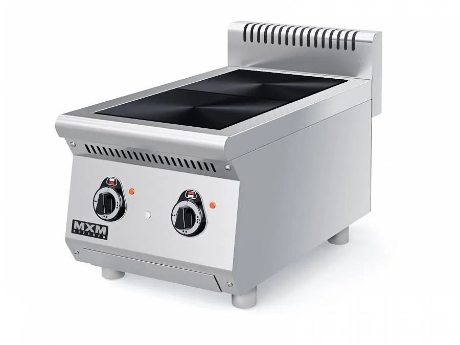 Особенности модели: полностью сделана из нержавеющей стали; выполнена с воздухоотводом; 2 зоны нагрева с гладкой поверхностью; конфорки выполнены из чугуна; 2 терморегулятора на передней панели; разогрев до максимальной температуры за 25 мин; аварийный терморегулятор исключает перегрев; ножки регулируются по высоте. Рабочие параметры: 2 конфорки общей мощностью — 5,6 кВт, мощность каждой — 2,8 кВт; размер конфорки — 2х300х300 мм; максимальная температура нагрева — 480С.