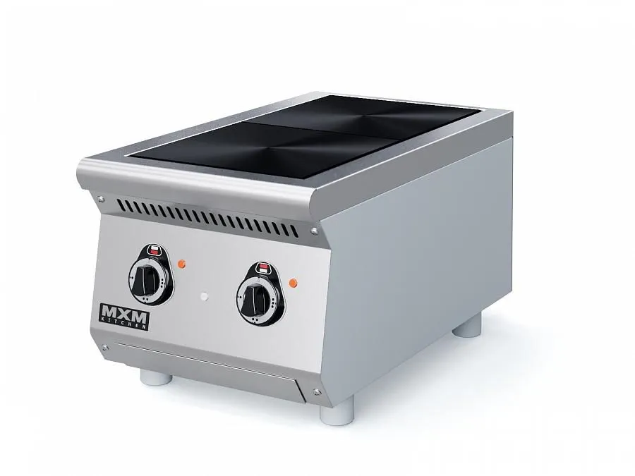 Особенности модели: фронтальная часть и столешница сделаны из нержавеющей стали; боковины из крашенного металла; 2 зоны нагрева с гладкой поверхностью; конфорки выполнены из чугуна; 2 терморегулятора на передней панели; разогрев до максимальной температуры за 25 мин; аварийный терморегулятор исключает перегрев; ножки регулируются по высоте. Рабочие параметры: 2 конфорки общей мощностью — 5,6 кВт, мощность каждой — 2,8 кВт; размер конфорки — 300х300 мм; максимальная температура нагрева — 480С.