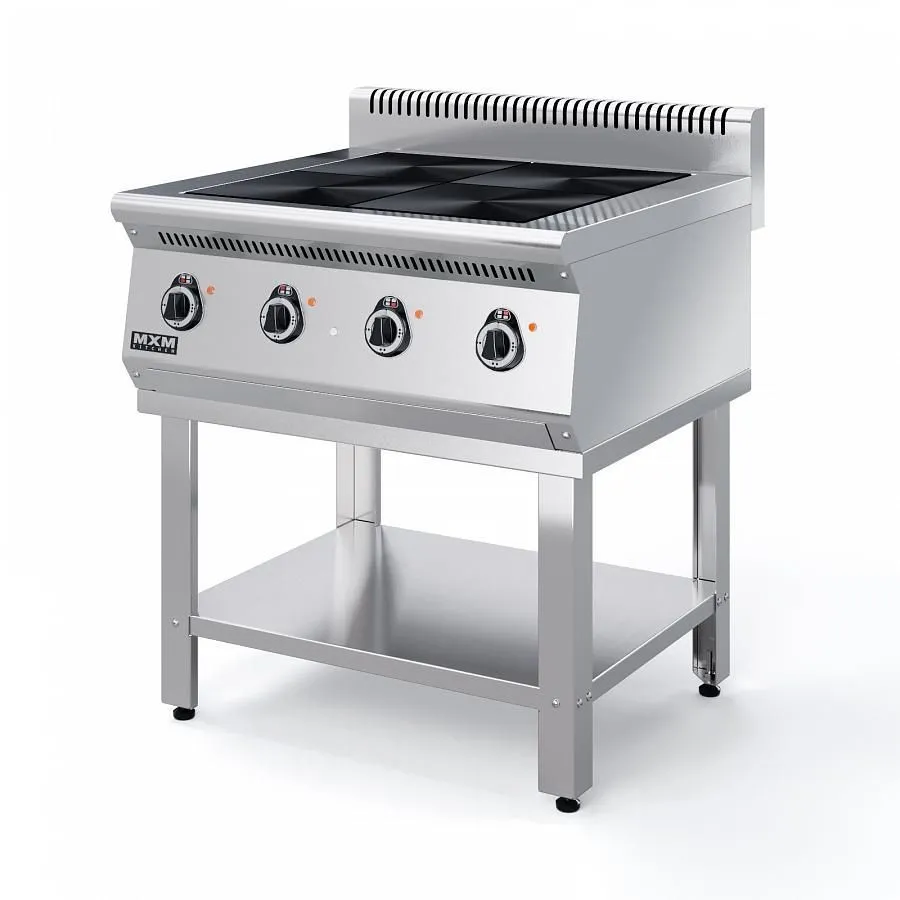 Особенности модели: есть воздуховод; плита полностью выполнена из нержавеющей стали; подставка из нержавеющей стали стали; 4 чугунные конфорки размером 300х300мм; форма конфорок — плоские квадратные; каждая конфорка мощностью 2,8 кВт (суммарная 11,2 кВт); терморегуляторы расположены на передней панели; максимальная температура нагрева — 480С; время разогрева до макс. температуры — 25 минут; аварийный терморегулятор исключает перегрев плиты.