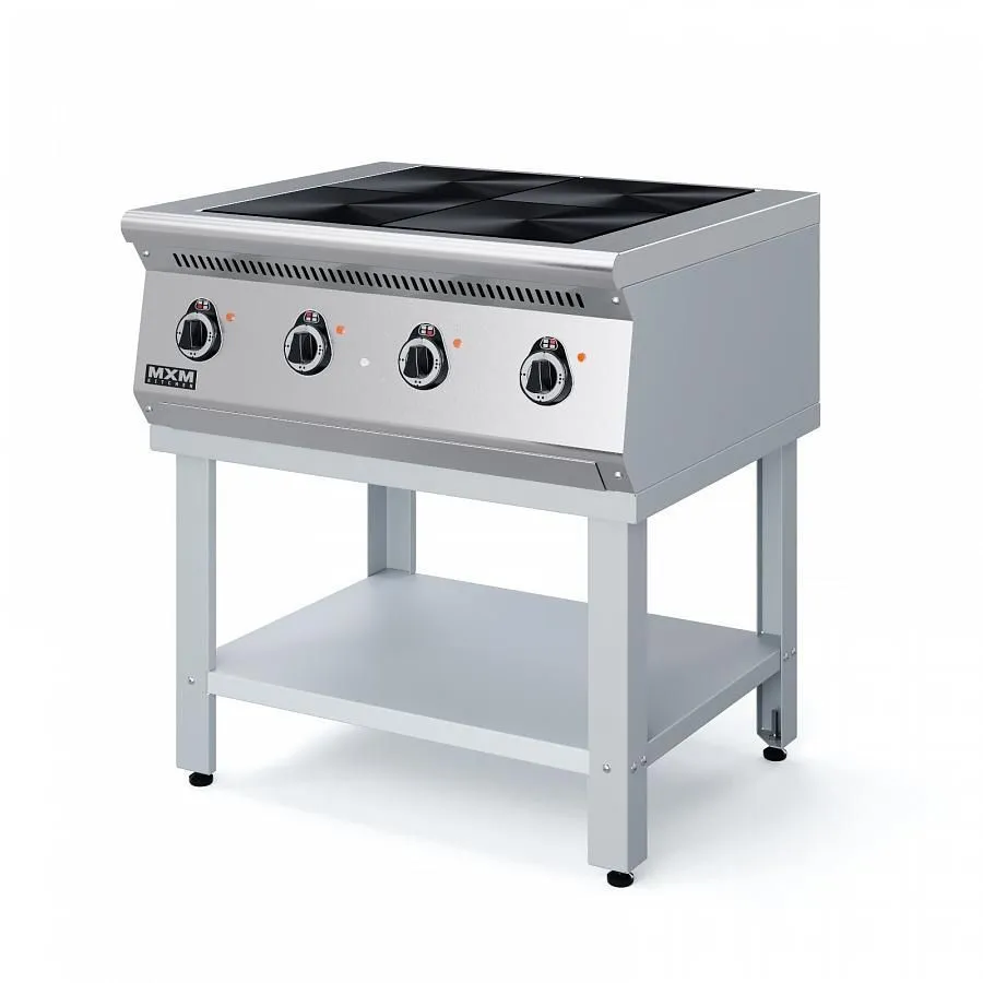Особенности модели: столешница и лицевая часть сделаны из нержавеющей стали; подставка и боковины из крашеной стали; 4 плоские чугунные конфорки размером 300х300мм; мощность каждой конфорки — 2,8 кВт (суммарная 11,2 кВт); терморегуляторы расположены на передней панели; максимальная температура нагрева — 480С; время разогрева до макс. температуры — 25 минут; аварийный терморегулятор от перегрева; ножки регулируются по высоте.