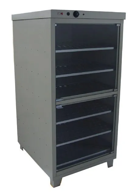 идеален для работы с пекарскими шкафами моделей ШЖЭ,  дно из н/стали с жалюзи, перестановка направления открывания стеклянных дверей, корпус окрашен порошковой краской(слоновая кость), полки из нерж. стали, плавная регулировка температуры, 6 направляющих с полками из нерж.стали под противни 600х400(12 шт) или 700х460 мм (12 шт), производительность за 1 загрузку - 144шт хлеб формовой (форма Л7); г. нетто 800х995х1660, 100кг; г.брутто:890х1070х1910; 120кг